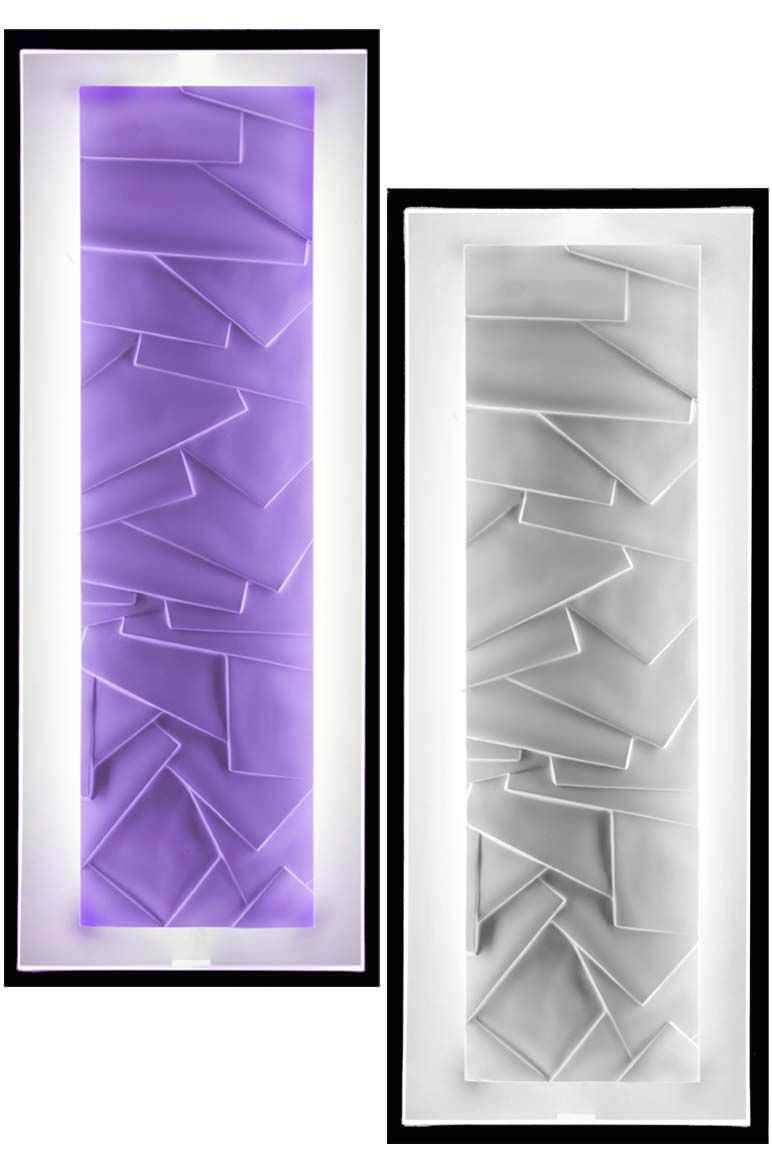 Applique luminaire sur l’esprit Zen japonais entre le 16ieme et le 18ieme siècle, EDO, ancien nom de la capitale Tokyo, représente un jeu de superpositions déstructurées, rehaussées par le jeu d’ombres et de lumières et la profondeur du blanc Olycale. L’ensemble en fait une œuvre à la fois très contemporaine et unique.