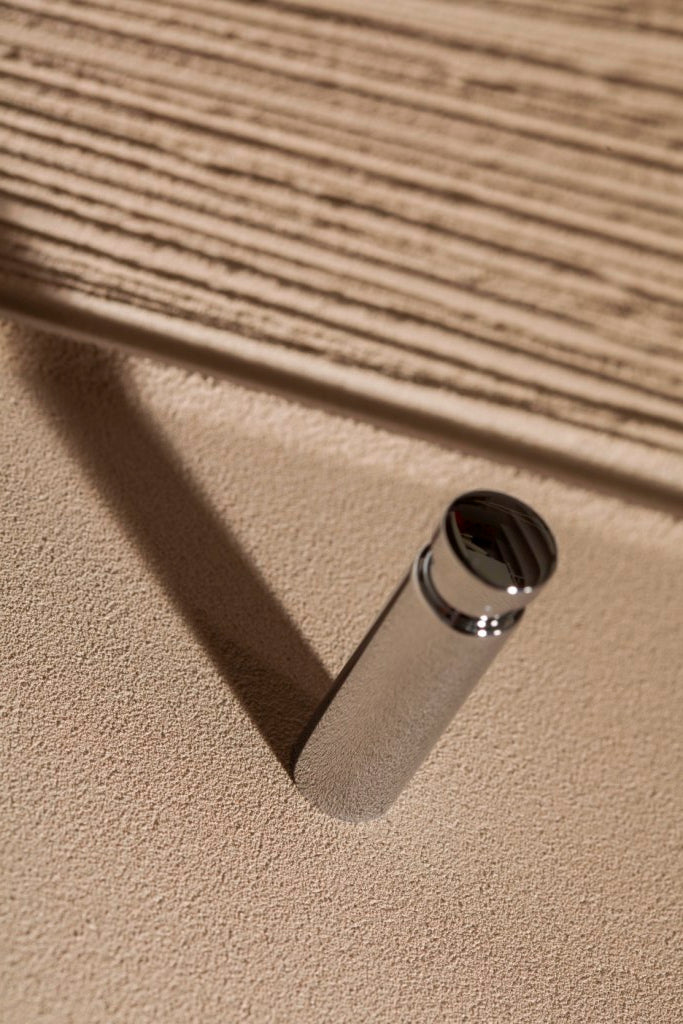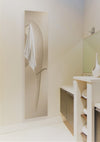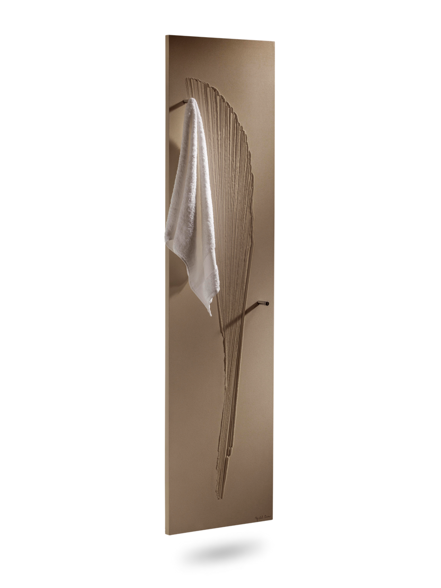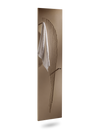 Telle une stèle marquant l’entrée d’un infini désert, ORIENTAL BAIN nous entraîne vers les lointains rivages de l’imaginaire saharien. Sa couleur, intemporelle et paisible, invite à un voyage intérieur, l’esprit divaguant volontiers sur les brumes de sable blond. En surface, avec la grâce silencieuse d’un éventail, le souffle chaud du vent a modelé un voile aux mille et un plissements.