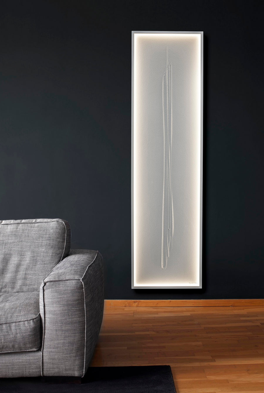 En option LED, ROC dispose d’un cadre lumineux de 5 Mètres en LED haute qualité de dernière génération. Dimmable par un bouton discret à hauteur d’homme, ROC devient alors un véritable luminaire. ROC propose ainsi 3 fonctions : Sculpture décorative, chauffage rayonnant de très haute qualité et luminaire LED haute performance.
